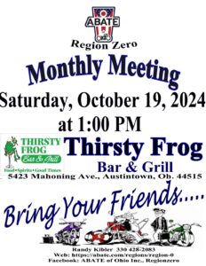 Regular Monthly Meeting for ABATE of Ohio, Inc. Region Zero. Always open to the public !!! Stop on in…..