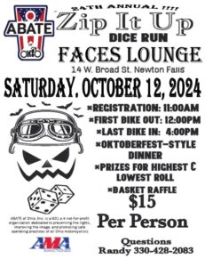 Region Zero’s 24th annual “Zip it Up” Run. “Zip up” the end of riding season with us !! Sign up starts: 11am, First Bike Out:12 Noon.